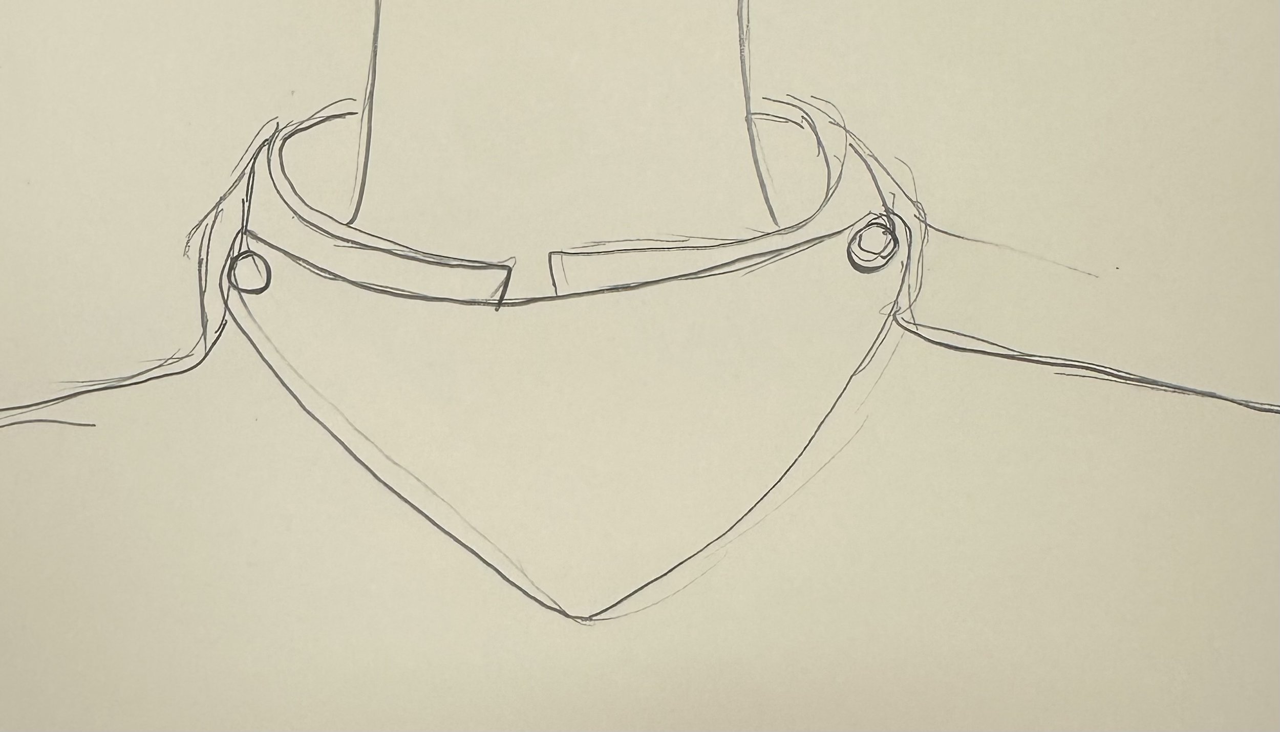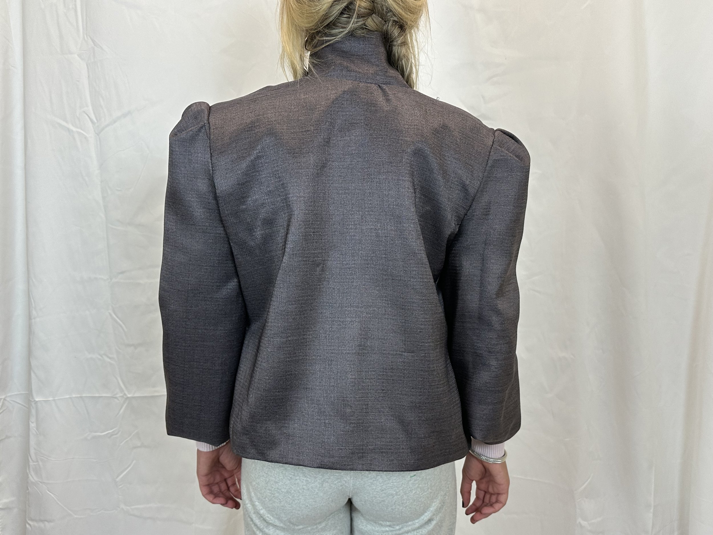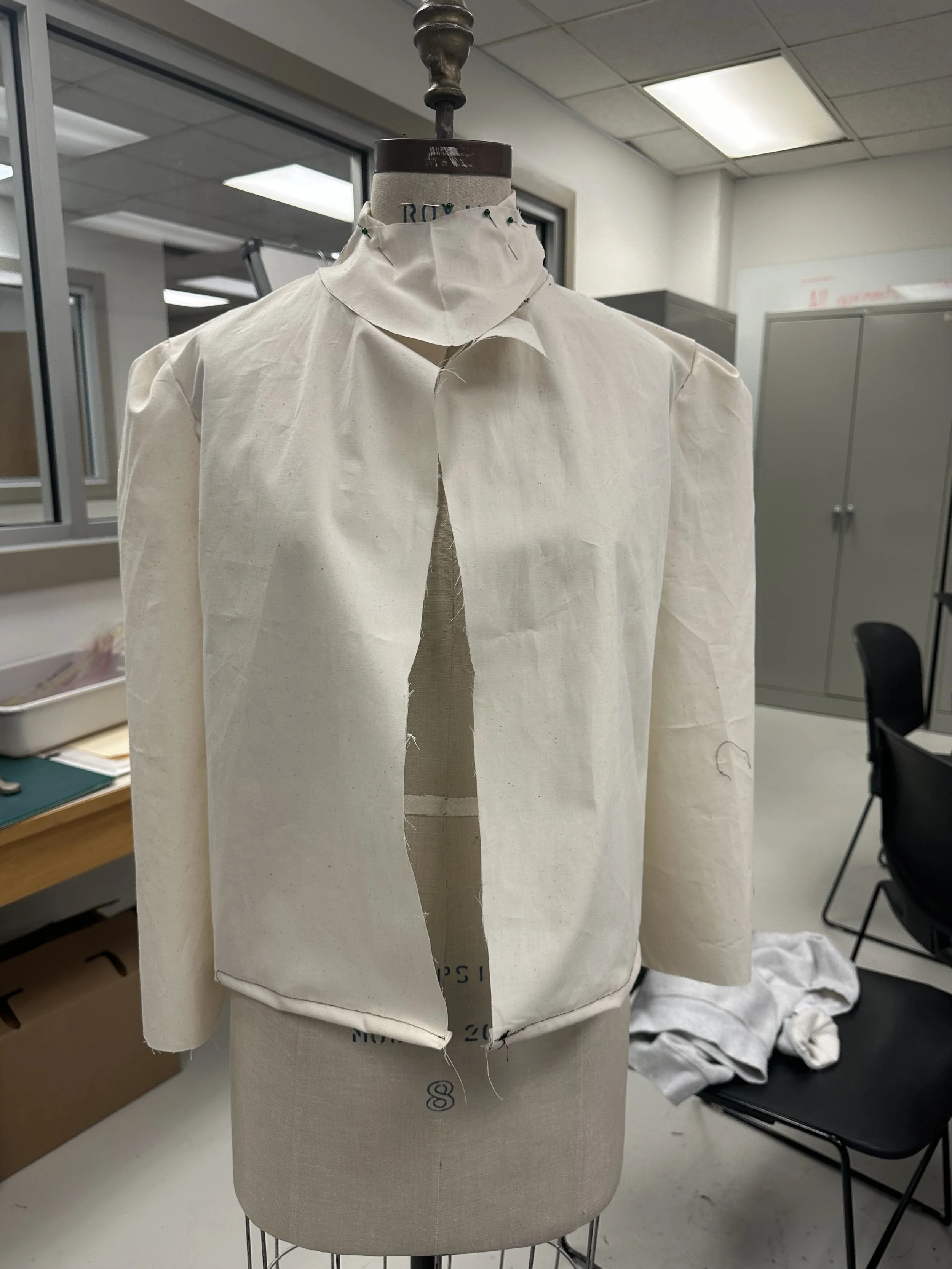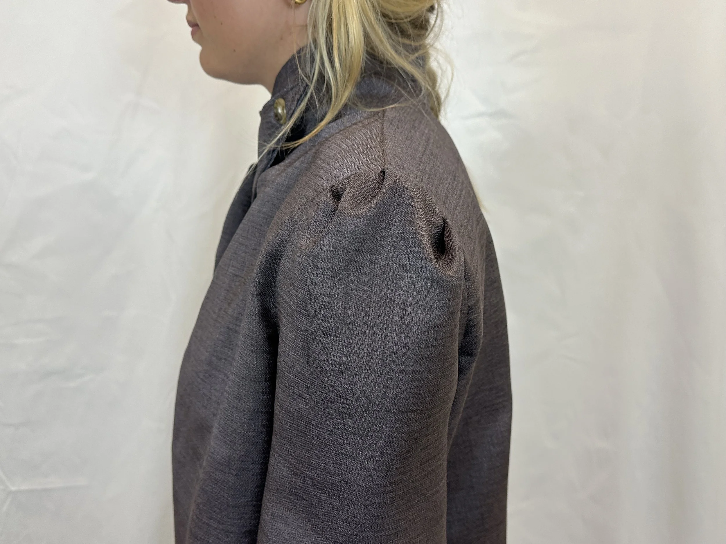 For my blazer, I wanted a structured boxy look. It features a stand up collar with a triangular piece that wraps around it, secured with two buttons. This can be detached at any time. I added gathers to the shoulders to give it volume, and subtly flared the ends of the sleeves. In the body I removed all darts to give the jacket a boxy look. I added a single welt pocket to the right hand side of the jacket.
